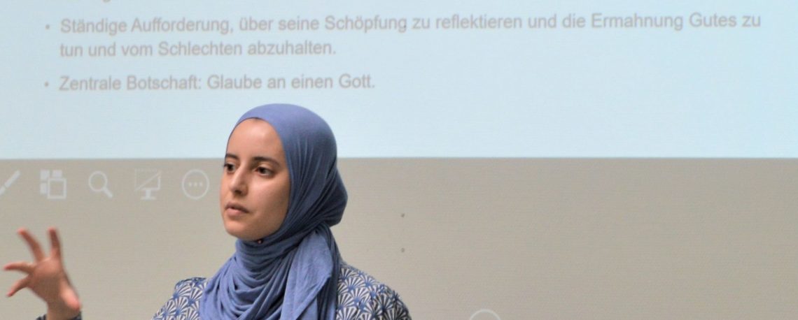 Wie ist das Verhältnis von Glaube und Naturwissenschaften aus muslimischer Sicht zu deuten? Diese Frage kam im Religionsunterricht auf, nachdem das Thema anhand von biblischen Schöpfungstexten aus christlicher Perspektive beleuchtet wurde. Frau Latifa Kaddouri, ein Vorstandsmitglied der Abu Bakr Moschee Frankfurt, kam als Referentin an die Hochtaunusschule. Auftakt ihres Vortrages war eine Einführung in die Haltung, mit der der Koran studiert werden soll: Die Eröffnung des Koran, die im Deutschen mit „Lies“ wiedergegeben wird, fordert zur lebenslangen Auseinandersetzung mit der göttlichen Offenbarung auf. Das Wort hat im Arabischen eine große Bedeutungsspanne: lesen, hinterfragen, verstehen, interpretieren. Diese Haltung kann die Richtung für die Beantwortung der Eingangsfrage vorgeben.